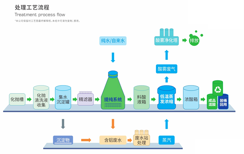 陽(yáng)極氧化工藝是鋁材成型產(chǎn)品前必不可少的一道工序,使用大量的磷酸,硫酸,硝酸對(duì)鋁件進(jìn)行清洗,導(dǎo)電,著色(屬高污染行業(yè))。隨著國(guó)家的“綠水青山”戰(zhàn)略,高污染行業(yè)的管控和排放標(biāo)準(zhǔn)大幅度提高,甚至很多地區(qū)提升為零排放。陽(yáng)極氧化廢水主要特點(diǎn)是,含磷高,PH低(負(fù)數(shù)),電導(dǎo)率高,污泥多。如果不對(duì)化拋廢水和陽(yáng)極廢水源頭管控,廢水處理很難穩(wěn)定磷的排放標(biāo)準(zhǔn),高電導(dǎo)率影響回用水水質(zhì)。 我公司堅(jiān)持以資源利用為方向,以提高經(jīng)濟(jì)效益為基礎(chǔ)。致力研發(fā)化拋清洗廢水提純濃縮混酸技術(shù)。目前化拋清洗廢水濃縮混酸技術(shù)以很成熟,因拋清洗廢水中鋁離子含量很高,濃縮后混酸中達(dá)到35mg/L以上,濃縮后的混酸無(wú)法回用的化拋槽。我司經(jīng)多次技術(shù)更新升級(jí),目前是國(guó)內(nèi)唯--家能將化拋清洗廢水中鋁離子處除率達(dá)70%以上,可100%回用于產(chǎn)線。
